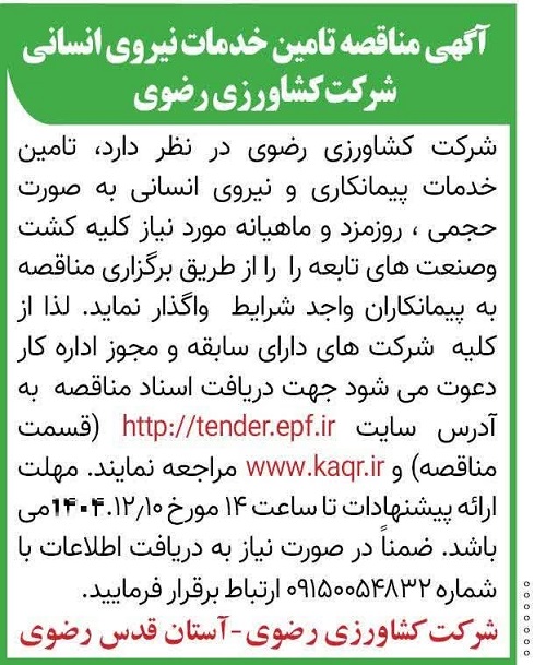 شرکت کشاورزی رضوی در نظر دارد، تامین خدمات پیمانکاری و نیروی انسانی به صورت حجمی ، روزمزد و ماهیانه مورد نیاز کلیه کشت وصنعت های تابعه را را از طریق برگزاری مناقصه به پیمانکاران واجد شرایط واگذار نماید. لذا از کلیه شرکت های دارای سابقه و مجوز اداره کار دعوت می شود جهت دریافت اسناد مناقصه به لینک زیر مراجعه نمایند. مهلت ارائه پیشنهادات تا ساعت ۱۴ مورخ ۱۴۰۴.۱۲.۱۰ می باشد.ضمناً در صورت نیاز به دریافت اطلاعات با شماره ۰۹۱۵۰۰۵۴۸۳۲ ارتباط برقرار فرمایید.